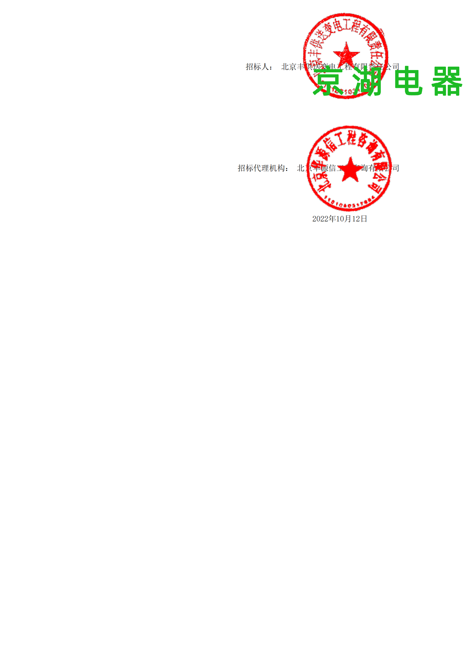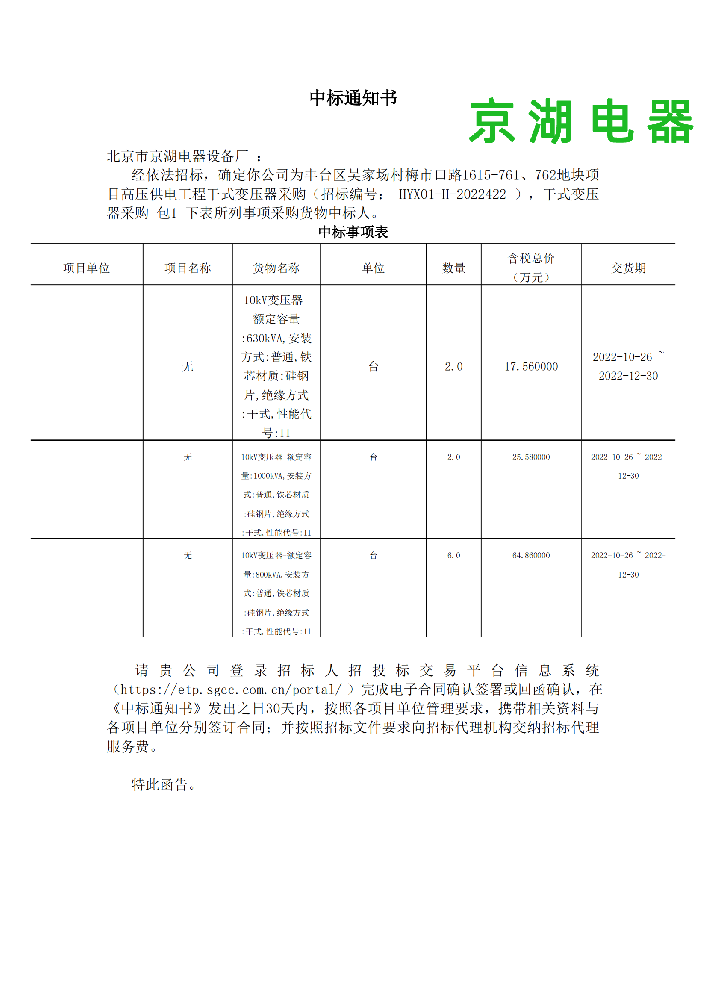 北京豐供送變電工程有限公司 中標(biāo)通知書