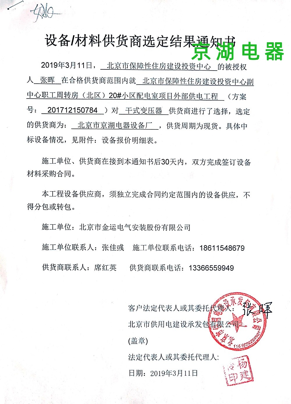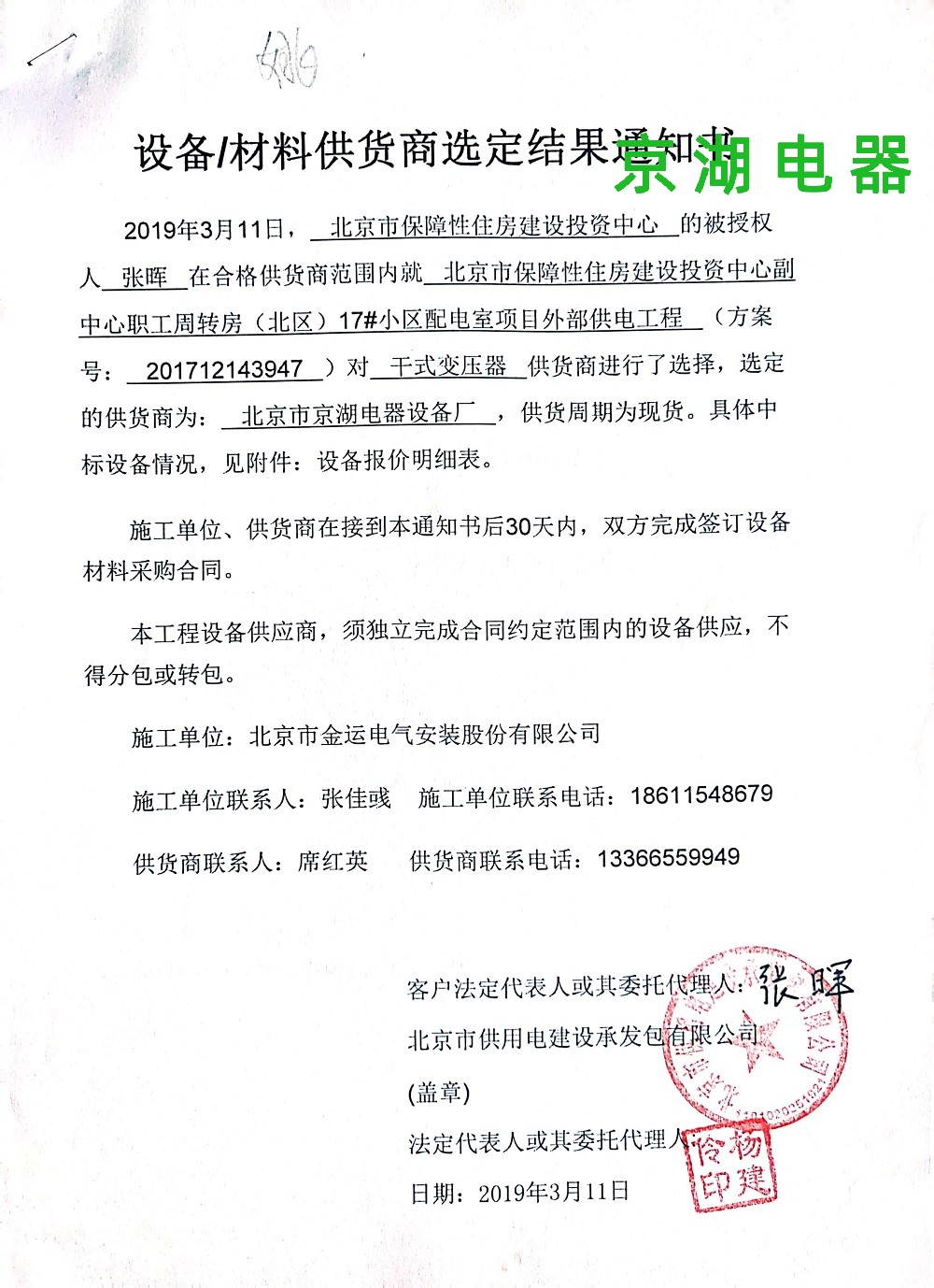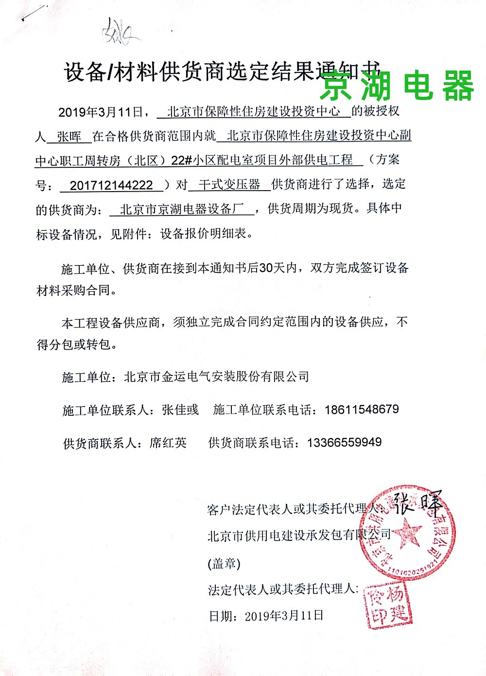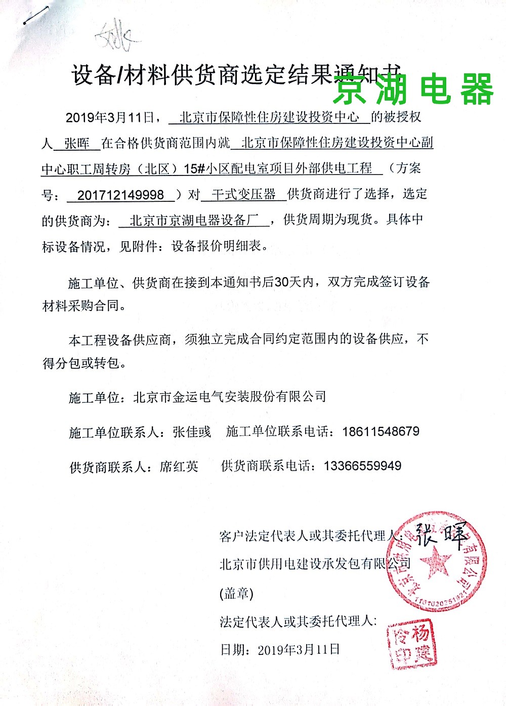 北京市保障性住房建設(shè)投資中心 供應(yīng)商選定結(jié)果通知書 2019年3月11日