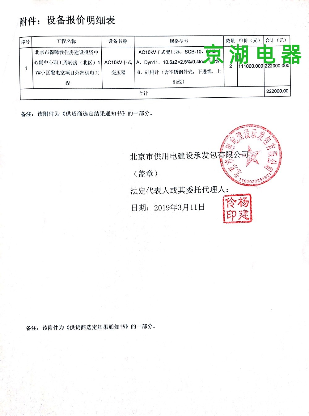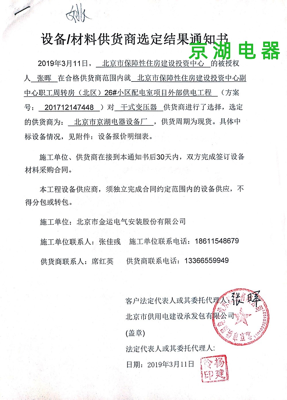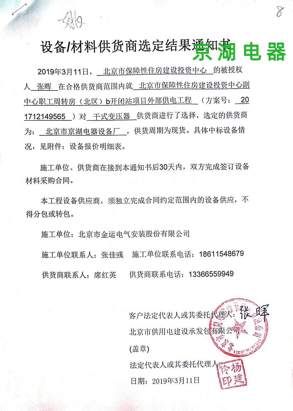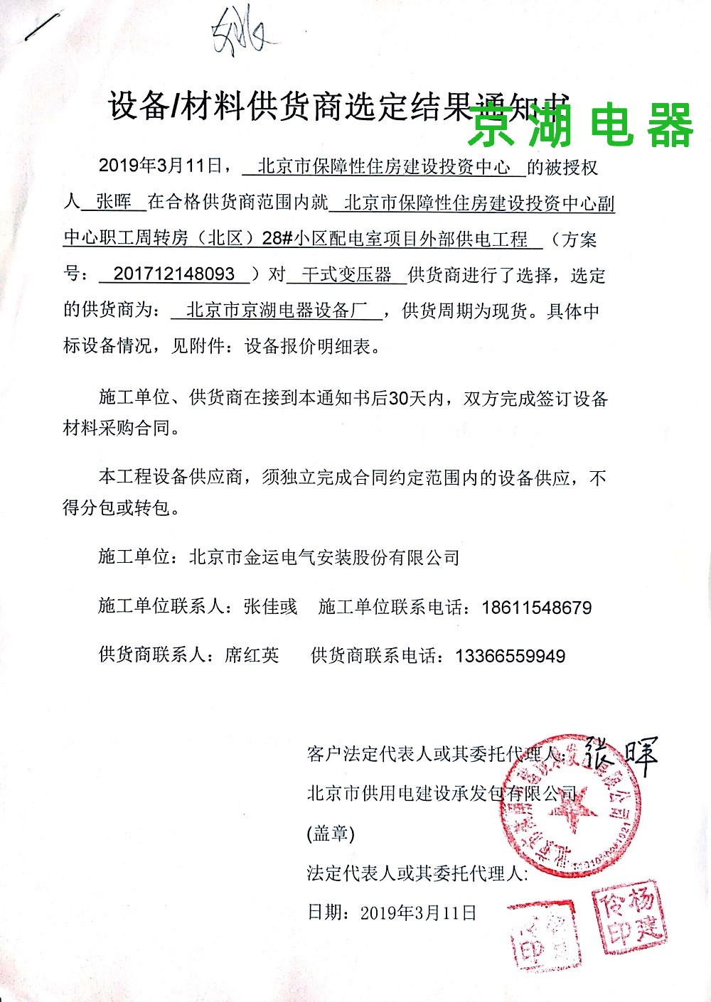 北京市保障性住房建設(shè)投資中心 供應(yīng)商選定結(jié)果通知書 2019年3月11日